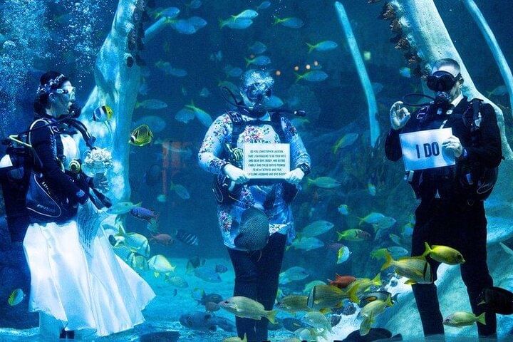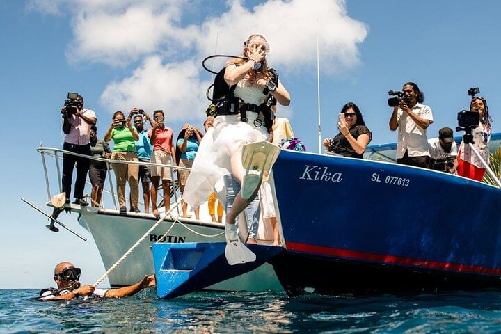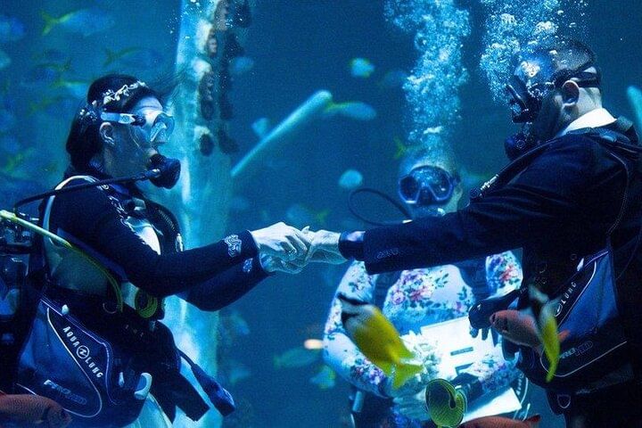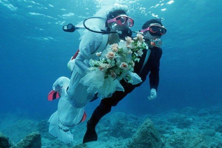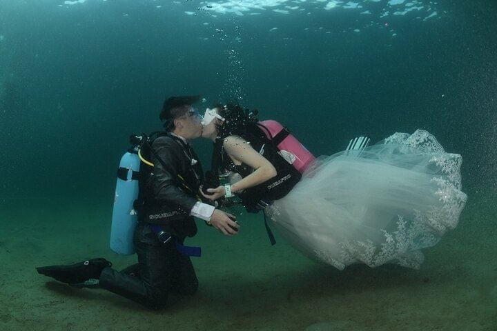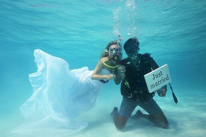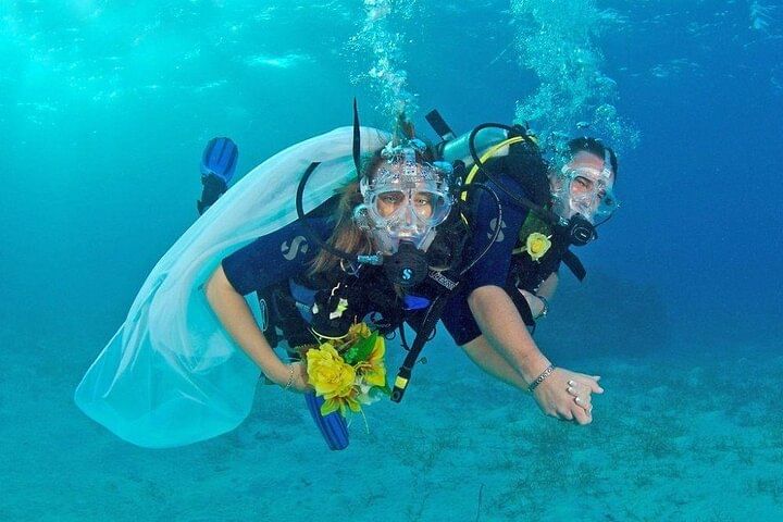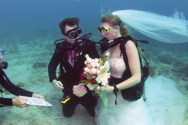 Enjoy hotel pick-up and drop-off in an air-conditioned vehicle, followed by a scenic boat trip. Dive at two beautiful spots with professional scuba instructors and propose underwater in a truly unique setting. Celebrate with a wedding cake, lunch, and refreshing drinks on board. A romantic adventure you’ll never forget!