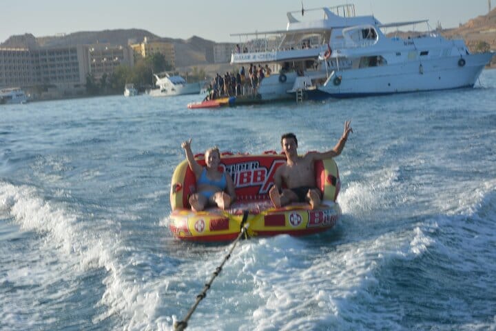 Dive into two guided snorkeling sessions at vibrant coral reefs of the Red Sea, feast on a delicious buffet lunch, and experience adrenaline-pumping water sports and parasailing with breathtaking aerial views.