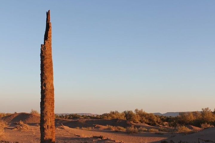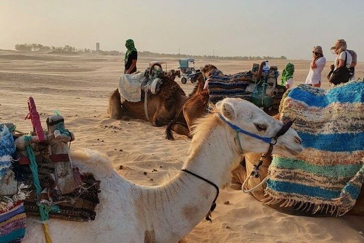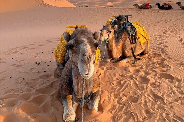 Continue your adventure across breathtaking valleys to Zagora, where a magical sunset camel ride awaits you amidst golden desert dunes. Spend the night in a luxurious desert camp, relaxing in your private tent featuring an en-suite bathroom, modern amenities, and authentic Berber style.