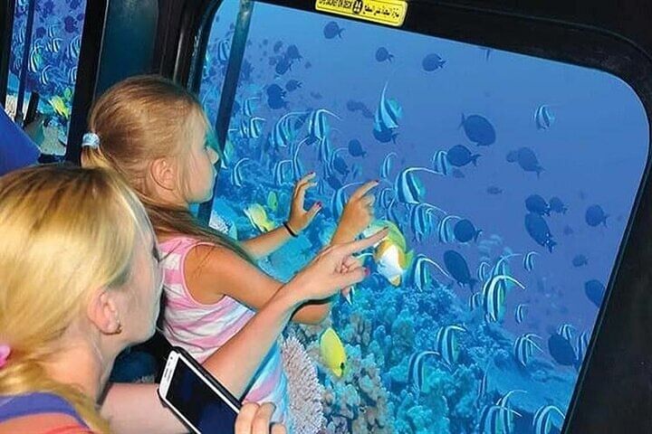 Experience a semi-submarine adventure in Sharm El Sheikh, exploring vibrant marine life and coral reefs through panoramic windows. After a comfortable ride, enjoy the underwater world without getting wet. Relax on a boat ride back to the marina, where tra